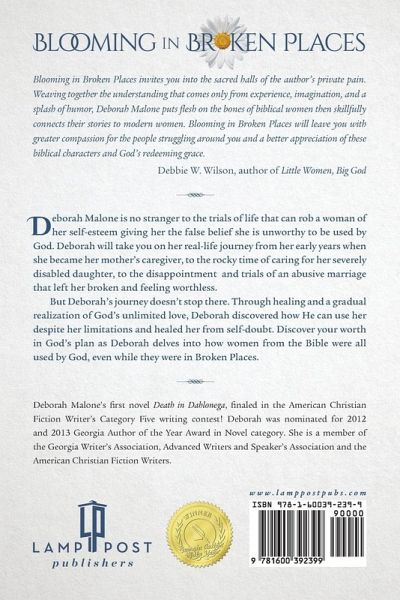 Deborah Malone is no stranger to the trials of life that can rob a woman of her self-esteem giving her the false belief she is unworthy to be used by God. Deborah will take you on her real-life journey from her early years when she became her mother's caregiver, to the rocky time of caring for her severely disabled daughter, to the disappointment and trials of an abusive marriage that left her broken and feeling worthless. But Deborah's journey doesn't stop there. Through healing and a gradual realization of God's unlimited love, Deborah discovered how He can use her despite her limitations and healed her from self-doubt. Discover your worth in God's plan as Deborah delves into how women from the Bible were all used by God, even while they were in Broken Places.