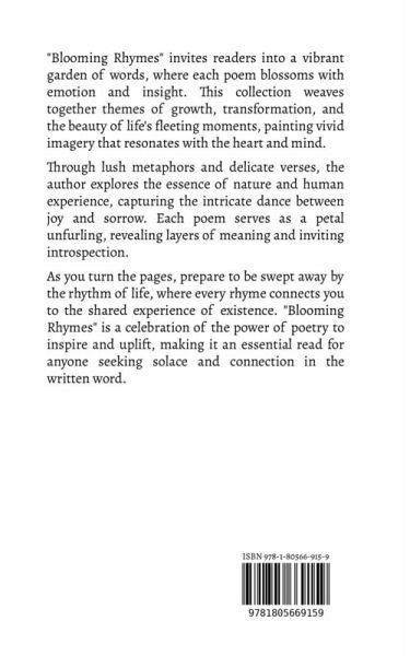 "Blooming Rhymes" invites readers into a vibrant garden of words, where each poem blossoms with emotion and insight. This collection weaves together themes of growth, transformation, and the beauty of life's fleeting moments, painting vivid imagery that resonates with the heart and mind. Through lush metaphors and delicate verses, the author explores the essence of nature and human experience, capturing the intricate dance between joy and sorrow. Each poem serves as a petal unfurling, revealing layers of meaning and inviting introspection. As you turn the pages, prepare to be swept away by the rhythm of life, where every rhyme connects you to the shared experience of existence. "Blooming Rhymes" is a celebration of the power of poetry to inspire and uplift, making it an essential read for anyone seeking solace and connection in the written word.