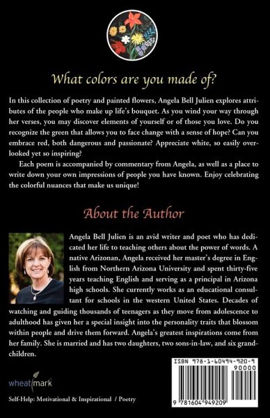 In this collection of poetry and painted flowers, Angela Bell Julien explores attributes of the people who make up life's bouquet. As you wind your way through her verses, you may discover elements of yourself or of those you love. Do you recognize the green that allows you to face change with a sense of hope? Can you embrace red, both dangerous and passionate? Appreciate white, so easily overlooked yet so inspiring? Each poem is accompanied by commentary from Angela, as well as a place to write down your own impressions of people you have known. Enjoy celebrating the colorful nuances that make us unique!