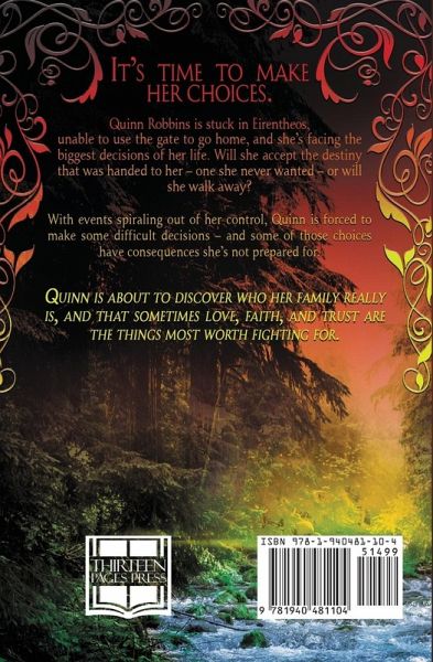 It's time to make her choices. Quinn Robbins is stuck in Eirentheos, unable to use the gate to go home, and she's facing the biggest decisions of her life. Will she accept the destiny that was handed to her - one she never wanted - or will she walk away? With events spiraling out of her control, Quinn is forced to make some difficult decisions - and some of those choices have consequences she's not prepared for. Quinn is about to discover who her family really is, and that sometimes love, faith, and trust are the things most worth fighting for.