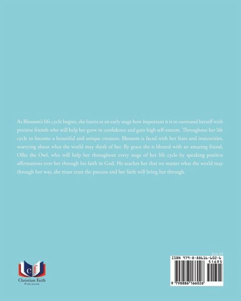 As Blossom's life cycle begins, she learns at an early stage how important it is to surround herself with positive friends who will help her grow in confidence and gain high self-esteem. Throughout her life cycle to become a beautiful and unique creature, Blossom is faced with her fears and insecurities, worrying about what the world may think of her. By grace she is blessed with an amazing friend, Ollie the Owl, who will help her throughout every stage of her life cycle by speaking positive affirmations over her through his faith in God. He teaches her that no matter what the world may through her way, she must trust the process and her faith will bring her through.