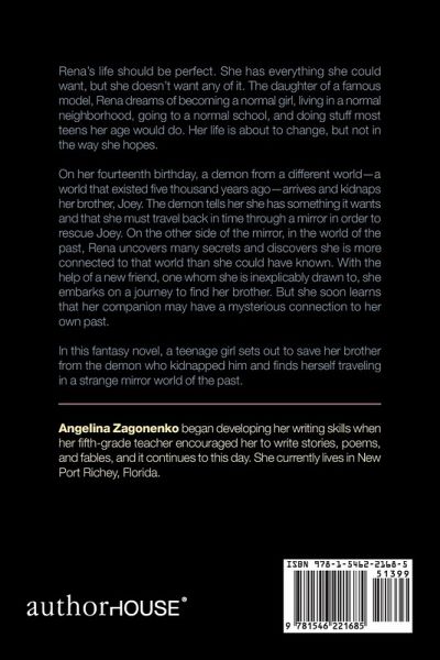 Rena's life should be perfect. She has everything she could want, but she doesn't want any of it. The daughter of a famous model, Rena dreams of becoming a normal girl, living in a normal neighborhood, going to a normal school, and doing stuff most teens her age would do. Her life is about to change, but not in the way she hopes. On her fourteenth birthday, a demon from a different world-a world that existed five thousand years ago-arrives and kidnaps her brother, Joey. The demon tells her she has something it wants and that she must travel back in time through a mirror in order to rescue Joey. On the other side of the mirror, in the world of the past, Rena uncovers many secrets and discovers she is more connected to that world than she could have known. With the help of a new friend, one whom she is inexplicably drawn to, she embarks on a journey to find her brother. But she soon learns that her companion may have a mysterious connection to her own past. In this fantasy novel, a teenage girl sets out to save her brother from the demon who kidnapped him and finds herself traveling in a strange mirror world of the past.
