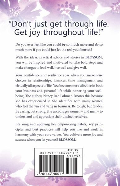 Do you ever feel like you could be so much more and do so much more if you could just let the real you flourish? With the ideas, practical advice and stories in BLOSSOM, you will be inspired and motivated to take bold steps and make changes to lead well, live well and give well. Your confidence and resilience soar when you make wise choices in relationships, finances, time management and virtually all aspects of life. You become more effective in both your business and personal life while honoring your well-being. The author, Nancy Rae Lohman, knows this because she has experienced it. She identifies with many women who feel the yin and yang in business: Be tough, but tender. Be caring, but strong. She encourages women - and men - to understand and appreciate their distinctive selves. Learning and applying her empowering habits, key principles and best practices will help you live and work in harmony with your core values. You cultivate more joy and success when you let yourself BLOSSOM.
