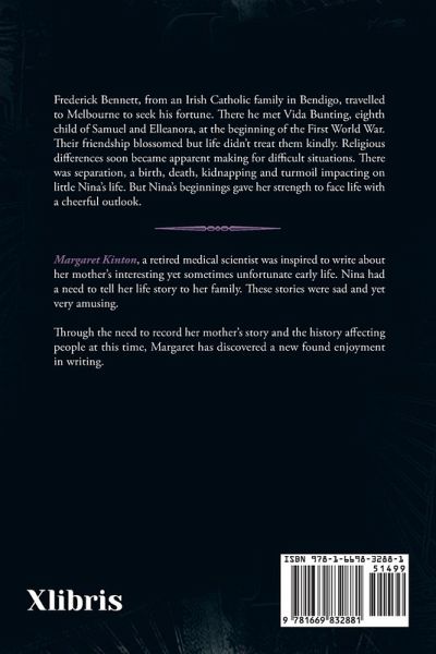 Frederick Bennett, from an Irish Catholic family in Bendigo, travelled to Melbourne to seek his fortune. There he met Vida Bunting, eighth child of Samuel and Elleanora, at the beginning of the First World War. Their friendship blossomed but life didn't treat them kindly. Religious differences soon became apparent making for difficult situations. There was separation, a birth, death, kidnapping and turmoil impacting on little Nina's life. But Nina's beginnings gave her strength to face life with a cheerful outlook.
