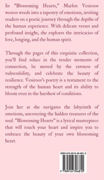 In "Blossoming Hearts," Marlen Vesiroos weaves words into a tapestry of emotions, inviting readers on a poetic journey through the depths of the human experience. With delicate verses and profound insight, she explores the intricacies of love, longing, and the human spirit. Through the pages of this exquisite collection, you'll find solace in the tender moments of connection, be moved by the rawness of vulnerability, and celebrate the beauty of resilience. Vesiroos's poetry is a testament to the strength of the human heart and its ability to bloom even in the harshest of conditions. Join her as she navigates the labyrinth of emotions, uncovering the hidden treasures of the soul. "Blossoming Hearts" is a lyrical masterpiece that will touch your heart and inspire you to embrace the beauty of your own blossoming heart. Copyright © 2024 Book Fairy Publishing