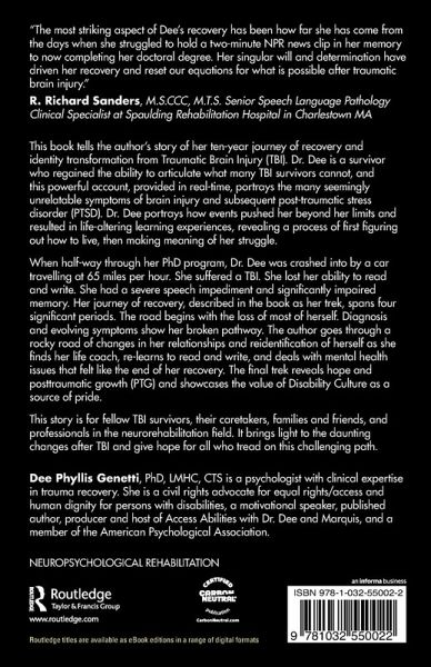 This book tells the authorâ s story of her ten-year journey of recovery and identity transformation from Traumatic Brain Injury (TBI). Dr. Dee is a survivor who regained the ability to articulate what many Traumatic Brain Injury (TBI) survivors cannot, and details the many seemingly unrelatable symptoms of brain injury and subsequent PTSD.