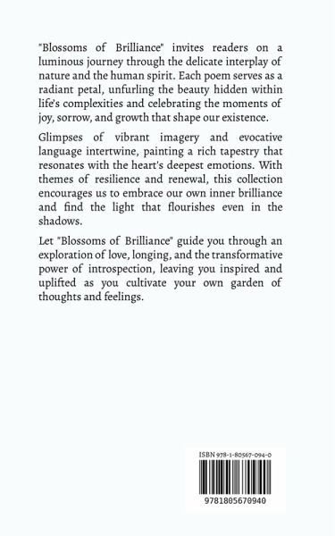 "Blossoms of Brilliance" invites readers on a luminous journey through the delicate interplay of nature and the human spirit. Each poem serves as a radiant petal, unfurling the beauty hidden within life's complexities and celebrating the moments of joy, sorrow, and growth that shape our existence. Glimpses of vibrant imagery and evocative language intertwine, painting a rich tapestry that resonates with the heart's deepest emotions. With themes of resilience and renewal, this collection encourages us to embrace our own inner brilliance and find the light that flourishes even in the shadows. Let "Blossoms of Brilliance" guide you through an exploration of love, longing, and the transformative power of introspection, leaving you inspired and uplifted as you cultivate your own garden of thoughts and feelings.