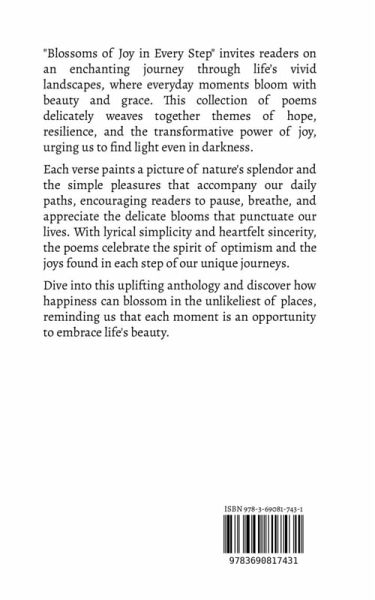 "Blossoms of Joy in Every Step" invites readers on an enchanting journey through life's vivid landscapes, where everyday moments bloom with beauty and grace. This collection of poems delicately weaves together themes of hope, resilience, and the transformative power of joy, urging us to find light even in darkness. Each verse paints a picture of nature's splendor and the simple pleasures that accompany our daily paths, encouraging readers to pause, breathe, and appreciate the delicate blooms that punctuate our lives. With lyrical simplicity and heartfelt sincerity, the poems celebrate the spirit of optimism and the joys found in each step of our unique journeys. Dive into this uplifting anthology and discover how happiness can blossom in the unlikeliest of places, reminding us that each moment is an opportunity to embrace life's beauty.