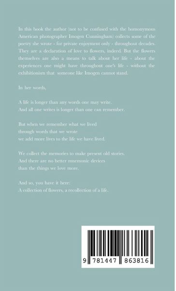 In this book the author (not to be confused with the homonymous American photographer Imogen Cunningham) collects some of the poetry she wrote - for private enjoyment only - throughout decades. They are a declaration of love to flowers, indeed. But the flowers themselves are also a means to talk about her life - about the experiences one might have throughout one's life - without the exhibitionism that someone like Imogen cannot stand. Other flowers - other poems - could be added, but these are the ones the author felt comfortable sharing at this point. May they be sufficient for the enjoyment of the reader.