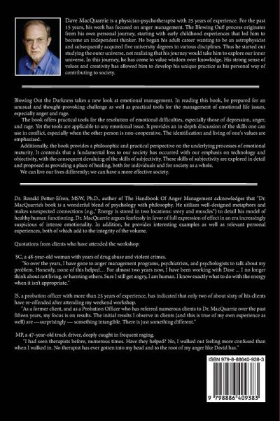 Blowing Out the Darkness takes a new look at emotional management. In reading this book, be prepared for an unusual and thought-provoking challenge as well as practical tools for the management of emotional life issues, especially anger, and rage. The book offers practical tools for the resolution of emotional difficulties, especially those of depression, anger, and rage. Yet the tools are applicable to any emotional issue. It provides an in-depth discussion of the skills one can use in conflict, especially when the other person is non-cooperative. The identification and living of one's values are emphasized. Additionally, the book provides a philosophic and practical perspective on the underlying processes of emotional maturity. It contends that a fundamental loss to our society has occurred with our emphasis on technology and objectivity, with the consequent devaluing of the skills of subjectivity. These skills of subjectivity are explored in detail and proposed as providing a place of healing, both for individuals and for society as a whole. We can live our lives differently; we can have a more effective society.