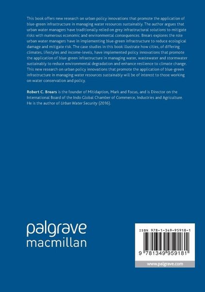 This book offers new research on urban policy innovations that promote the application of blue-green infrastructure in managing water resources sustainably. The author argues that urban water managers have traditionally relied on grey infrastructural solutions to mitigate risks with numerous economic and environmental consequences. Brears explores the role urban water managers have in implementing blue-green infrastructure to reduce ecological damage and mitigate risk. The case studies in this book illustrate how cities, of differing climates, lifestyles and income-levels, have implemented policy innovations that promote the application of blue-green infrastructure in managing water, wastewater and stormwater sustainably to reduce environmental degradation and enhance resilience to climate change. This new research on urban policy innovations that promote the application of blue-green infrastructure in managing water resources sustainably will be of interest to those working on water conservation and policy.