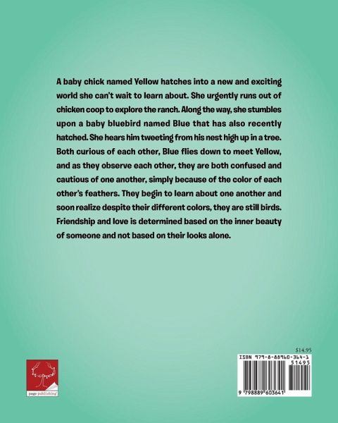A baby chick named Yellow hatches into a new and exciting world she can't wait to learn about. She urgently runs out of chicken coop to explore the ranch. Along the way, she stumbles upon a baby bluebird named Blue that has also recently hatched. She hears him tweeting from his nest high up in a tree. Both curious of each other, Blue flies down to meet Yellow, and as they observe each other, they are both confused and cautious of one another, simply because of the color of each other's feathers. They begin to learn about one another and soon realize despite their different colors, they are still birds. Friendship and love is determined based on the inner beauty of someone and not based on their looks alone.