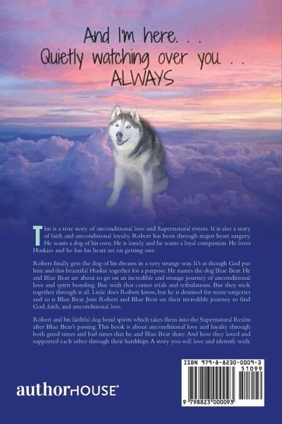 This is a true story of unconditional love and Supernatural events. It is also a story of faith and unconditional loyalty. Robert has been through major heart surgery. He wants a dog of his own. He is lonely and he wants a loyal companion. He loves Huskies and he has his heart set on getting one. Robert finally gets the dog of his dreams in a very strange way. It's as though God put him and this beautiful Huskie together for a purpose. He names the dog Blue Bear. He and Blue Bear are about to go on an incredible and strange journey of unconditional love and spirit bonding. But with that comes trials and tribulations. But they stick together through it all. Little does Robert know, but he is destined for more surgeries and so is Blue Bear. Join Robert and Blue Bear on their incredible journey to find God, faith, and unconditional love. Robert and his faithful dog bond spirits which takes them into the Supernatural Realm after Blue Bear's passing. This book is about unconditional love and loyalty through both good times and bad times that he and Blue Bear share. And how they loved and supported each other through their hardships. A story you will love and identify with.