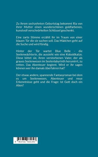 Zu ihrem sechzehnten Geburtstag bekommt Ria von ihrer Mutter einen wunderschönen goldfarbenen, kunstvoll verschnörkelten Schlüssel geschenkt.Eine zarte Stimme erzählt ihr im Traum von einer blauen Tür die sie suchen soll. Das Mädchen geht auf die Suche und wird fündig.Hinter der Tür wartet Blue Belle - die Seelenwächterin, die aussieht wie eine Koboldkatze. Diese bittet sie, ihren verstorbenen Vater, der als graues Seelenwesen im Seelenlabyrinth herumirrt, zu retten. Das Abenteuer beginnt. Wird er ihr sagen können wer ihn damals überfahren hat?Der etwas andere Fantasyroman bei dem es um Seelenwesen, Abenteuer und neue Erkenntnisse geht und die Frage: Ist Gott doch ein Alien?