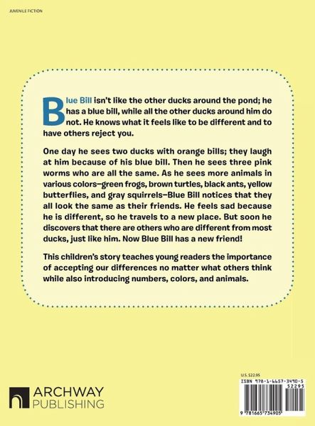 Blue Bill isn't like the other ducks around the pond; he has a blue bill, while all the other ducks around him do not. He knows what it feels like to be different and to have others reject you. One day he sees two ducks with orange bills; they laugh at him because of his blue bill. Then he sees three pink worms who are all the same. As he sees more animals in various colors-green frogs, brown turtles, black ants, yellow butterflies, and gray squirrels-Blue Bill notices that they all look the same as their friends. He feels sad because he is different, so he travels to a new place. But soon he discovers that there are others who are different from most ducks, just like him. Now Blue Bill has a new friend! This children's story teaches young readers the importance of accepting our differences no matter what others think while also introducing numbers, colors, and animals.