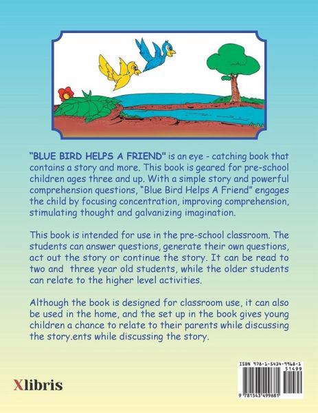 BLUE BIRD HELPS A FRIEND" is an eye-catching book that contains a story and more. This book is geared for pre-school children ages three and up. With a simple story and powerful comprehension questions, "BLUE BIRD HELPS A FRIEND" engages the child by focusing concentration, improving comprehension, stimulating thought and galvanizing imagination. This book is intended for use in the pre-school classroom. The students can answer questions, generate their own questions, act out the story or continue the story. It can be read to two and three year old students, while the older students can relate to the higher level activities. Although the book is designed for for classroom use, it can also be used in the home, and the setup in the book gives young children a chance to relate to their parents while discussing the story.