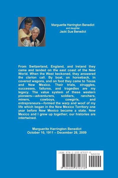 From Switzerland, England, and Ireland they came and landed on the east coast of the New World. When the West beckoned, they answered the clarion call. By boat, on horseback, in covered wagons, and on foot they came to Texas and New Mexico. Their trials, struggles, successes, failures, and tragedies are my legacy. The value system of these western pioneers-adventurers, soldiers, ranchers, miners, cowboys, cowgirls, and entrepreneurs-formed the warp and woof of my life which began in the New Mexico Territory one year before New Mexico became a state. New Mexico and I grew up together; our histories are intertwined. Marguerite Harrington Benedict