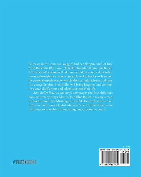 All paws in for some tail-waggin' and ear-floppin' kind of fun! Meet Bullet the Blue Great Dane! His friends call him Blue Bullet. The Blue Bullet books will take your child on a comical, heartfelt journey through the eyes of a Great Dane. His books are based on his personal experiences, where children can relate, learn, and have fun alongside him. Blue Bullet will bring laughter and comfort into your child's heart and adventure into their life! Blue Bullet Rides in Mommy's Mustang is the first children's book written by Kiaya Martin. Join Blue Bullet in taking a road trip in his mommy's Mustang convertible for the first time. Get ready to fetch more playful adventures with Blue Bullet as he continues to share his stories through more books to come!