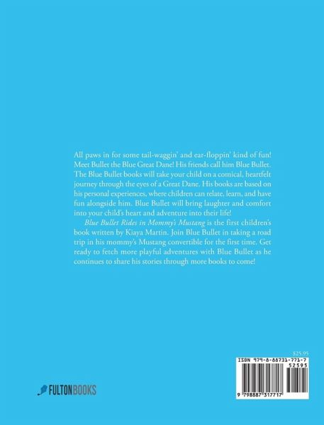All paws in for some tail-waggin' and ear-floppin' kind of fun! Meet Bullet the Blue Great Dane! His friends call him Blue Bullet. The Blue Bullet books will take your child on a comical, heartfelt journey through the eyes of a Great Dane. His books are based on his personal experiences, where children can relate, learn, and have fun alongside him. Blue Bullet will bring laughter and comfort into your child's heart and adventure into their life! Blue Bullet Rides in Mommy's Mustang is the first children's book written by Kiaya Martin. Join Blue Bullet in taking a road trip in his mommy's Mustang convertible for the first time. Get ready to fetch more playful adventures with Blue Bullet as he continues to share his stories through more books to come!