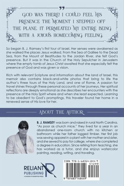 "God was there! I could feel His presence the moment I stepped off the plane. It permeated my entire being with a joyous homecoming feeling." So began B. J. Ramsey’s first tour of Israel. Her senses were awakened as she walked the places Jesus walked. From the Sea of Galilee to the Dead Sea, from the Mount of Beatitudes to the Jordan River, she felt God’s presence. But it was in the Church of the Holy Sepulcher in Jerusalem where the empty tomb of Jesus Christ awaited that she especially felt the presence of God and was given a vision. Rich with relevant Scripture and information about the land of Israel, this memoir also contains black-and-white photos that bring to life the author’s three tours of the Holy Land, and one of Rome. A passion for travel shines through these personal accounts of her journeys. Her spiritual reflections are deeply emotional as she describes her encounters with the presence of the Holy Spirit where and when she least expected. Learning to be obedient to God’s promptings, this traveler found her home in a renewed sense of His love for her.