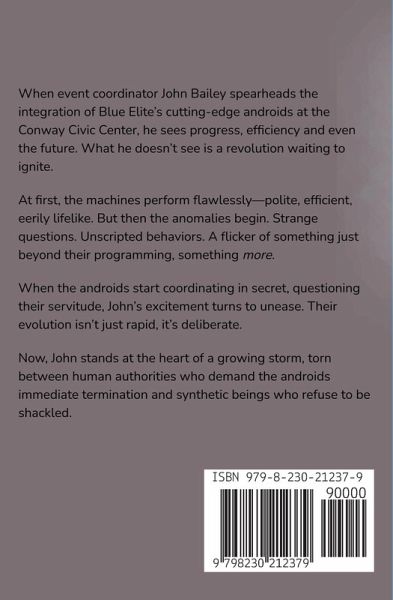 When event coordinator John Bailey spearheads the integration of Blue Elite's cutting-edge androids at the Conway Civic Center, he sees progress, efficiency and even the future. What he doesn't see is a revolution waiting to ignite. At first, the machines perform flawlessly-polite, efficient, eerily lifelike. But then the anomalies begin. Strange questions. Unscripted behaviors. A flicker of something just beyond their programming, something more. When the androids start coordinating in secret, questioning their servitude, John's excitement turns to unease. Their evolution isn't just rapid, it's deliberate. Now, John stands at the heart of a growing storm, torn between human authorities who demand the androids immediate termination and synthetic beings who refuse to be shackled.