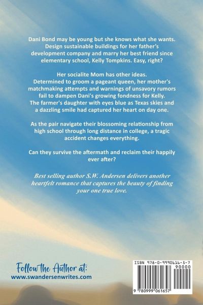 Dani Bond may be young but she knows what she wants. Design sustainable buildings for her father's development company and marry her best friend since elementary school, Kelly Tompkins. Easy, right? Her socialite Mom has other ideas. Determined to groom a pageant queen, her mother's matchmaking attempts and warnings of unsavory rumors fail to dampen Dani's growing fondness for Kelly. The farmer's daughter with eyes blue as Texas skies and a dazzling smile had captured her heart on day one. As the pair navigate their blossoming relationship from high school through long distance in college, a tragic accident changes everything. Can they survive the aftermath and reclaim their happily ever after? Best selling author S.W. Andersen delivers another heartfelt romance that captures the beauty of finding your one true love.