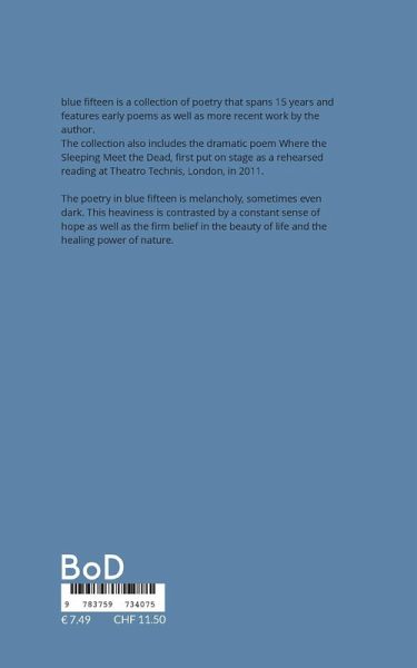 blue fifteen is a collection of poetry that spans 15 years and features early poems as well as more recent work by the author. The collection also includes the dramatic poem Where the Sleeping Meet the Dead, first put on stage as a rehearsed reading at Theatro Technis, London, in 2011. The poetry in blue fifteen is melancholy, sometimes even dark. This heaviness is contrasted by a constant sense of hope as well as the firm belief in the beauty of life and the healing power of nature.