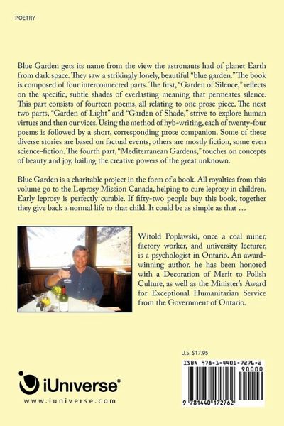 Blue Garden gets its name from the view the astronauts had of planet Earth from dark space. They saw a strikingly lonely, beautiful "blue garden." The book is composed of four interconnected parts. The first, "Garden of Silence," reflects on the specific, subtle shades of everlasting meaning that permeates silence. This part consists of fourteen poems, all relating to one prose piece. The next two parts, "Garden of Light" and "Garden of Shade," strive to explore human virtues and then our vices. Using the method of hyb-writing, each of twenty-four poems is followed by a short, corresponding prose companion. Some of these diverse stories are based on factual events, others are mostly fiction, some even science-fiction. The fourth part, "Mediterranean Gardens," touches on concepts of beauty and joy, hailing the creative powers of the great unknown. Blue Garden is a charitable project in the form of a book. All royalties from this volume go to the Leprosy Mission Canada, helping to cure leprosy in children. Early leprosy is perfectly curable. If fifty-two people buy it, together they give back a normal life to that child. It could be as simple as that...