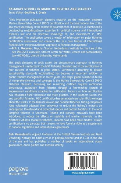 This book discusses to what extent the precautionary approach to fisheries management is reflected in the MSC Fisheries Standard and in the certification of four clusters of fisheries in polar waters. Certification according to private sustainability standards (ecolabelling) has become an important addition to public fisheries management in recent years. The major global ecolabel in terms of comprehensiveness and coverage is the Marine Stewardship Council (MSC) Fisheries Standard. Becoming and remaining certified requires continuous behavioural adaptation from fisheries through a fine-meshed system of improvement conditions attached to certification. Focus is on how certification has influenced fisher behaviour and state practice. In the Southern Ocean krill and toothfish fisheries, MSC certification has generated new scientific knowledge about the stocks. In the Barents Sea cod and haddock fisheries, fishing companies have voluntarily adapted their behaviour to reduce the fishery's impacts on endangered, threatened and protected species and bottom habitats. In the local lumpfish fisheries in Greenland, Iceland and Norway, measures have been introduced to reduce the effects on seabirds and marine mammals. In the Northeast Atlantic mackerel fisheries, impacts have been more modest. Private certification is no panacea, but it seems to have found a niche as a supplement to national legislation and international agreements.