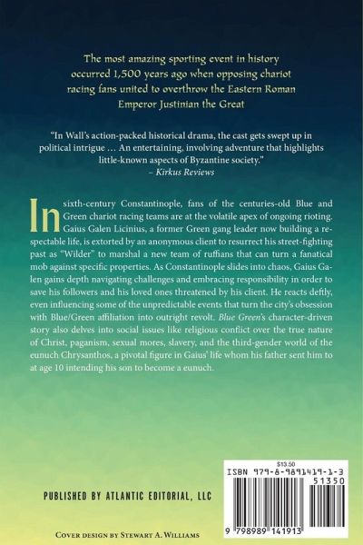In sixth-century Constantinople, seat of the Eastern Roman Empire, fans of the centuries-old Blue and Green chariot racing teams are at the volatile apex of their post-race rioting. Gaius Galen Licinius, a former Green gang leader now building a respectable life, is extorted by an anonymous client to resurrect his street-fighting past as "Wilder" to marshal a new team of ruffians that can turn a fanatical mob against specific properties. As Constantinople slides into chaos, Gaius Galen gains depth navigating challenges and embracing responsibility in order to save his followers and his loved ones threatened by his client. He reacts deftly, even influencing some of the action and tumultuous events that turn the city's obsession with sports affiliation into outright revolt. Gaius takes readers into the heart of the action and its underlying causes. Blue Green's character-driven story also delves into social issues like religious conflict over the true nature of Christ as paganism wanes, sexual mores, slavery, and the third-gender world of the eunuch Chrysanthos, a pivotal figure in Gaius' life whom his father sent him to at age 10 intending his son to become a eunuch. The colorful cast supporting Gaius, a funny and observant hero, includes his steadfast slave and friend Tedius, his spirited girlfriend and reforming prostitute Messalina, mad monk Brother Zazo, jovial charioteer Scorpus, and loyal fighters Lukos, the Hun Atakam, Estrilda and Jacob the Jew.