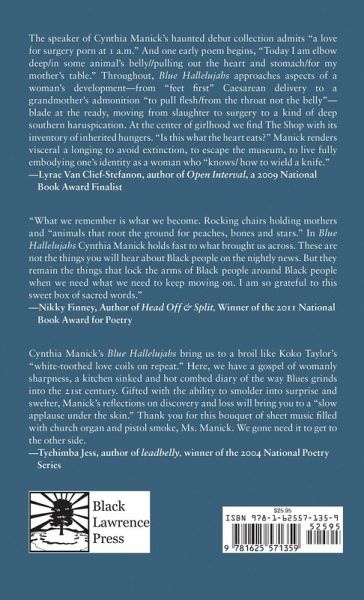 "Cynthia Manick's BLUE HALLELUJAHS bring us to a broil like Koko Taylor's 'white-toothed love coils on repeat.' Here, we have a gospel of womanly sharpness, a kitchen sinked and hot combed diary of the way Blues grinds into the 21st century. Gifted with the ability to smolder into surprise and swelter, Manick's reflections on discovery and loss will bring you to a 'slow applause under the skin.' Thank you for this bouquet of sheet music filled with church organ and pistol smoke, Ms. Manick. We gone need it to get to the other side."-Tyehimba Jess "What we remember is what we become. Rocking chairs holding mothers and 'animals that root the ground for peaches, bones and stars.' In BLUE HALLELUJAHS Cynthia Manick holds fast to what brought us across. These are not the things you will hear about Black people on the nightly news. But they remain the things that lock the arms of Black people around Black people when we need what we need to keep moving on. I am so grateful to this sweet box of sacred words."-Nikky Finney "The speaker of Cynthia Manick's haunted debut collection admits 'a love for surgery porn at 1 a.m.' And one early poem begins, 'Today I am elbow deep / in some animal's belly // pulling out the heart and stomach / for my mother's table.' Throughout, BLUE HALLELUJAHS approaches aspects of a woman's development-from 'feet first' Caesarean delivery to a grandmother's admonition 'to pull flesh / from the throat not the belly'-blade at the ready, moving from slaughter to surgery to a kind of deep southern haruspication. At the center of girlhood we find The Shop with its inventory of inherited hungers. 'Is this what the heart eats?' Manick renders visceral a longing to avoid extinction, to escape the museum, to live fully embodying one's identity as a woman who 'knows / how to wield a knife.'-Lyrae Van Clief-Stefanon
