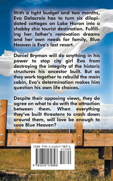 With a tight budget and two months, Eva Delacroix has to turn six dilapidated cottages on Lake Huron into a shabby chic tourist destination. Fulfilling her father's renovation dreams and her own needs for family, Blue Heaven is Eva's last resort. Daniel Bryman will do anything in his power to stop city girl Eva from destroying the integrity of the historic structures his ancestor built. But as they work together to rebuild the main cabin, Eva's determination makes him question his own life choices. Despite their opposing views, they do agree on what to do with the attraction between them. When everything they've built threatens to crash down around them, will love be enough to save Blue Heaven?
