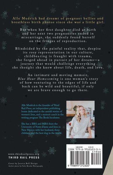 How do we continue to live after unfathomable loss? This debut memoir takes a situation that most find incomprehensible-life after the death of a child-and turns it into universal wisdom on how to live whatever life you've been given. Alle Mudrick had dreamt of pregnant bellies and breathless birth photos since she was a little girl. But when her first daughter died at birth and her next two pregnancies ended in miscarriage, she suddenly found herself on the fringes of reproduction, questioning how she could possibly live after such extreme loss. Caught between a body not built for childbearing and her own desperate need to have a living child, Alle forged ahead in pursuit of her dreams-a journey that would bring her even further into reproductive trauma and challenge everything she thought she knew about life, death, and love. An intimate and moving memoir, Blue Hour Homecoming is one woman's story of how venturing to the edges of life and back can be wild and beautiful, if only we are brave enough to go there.