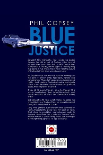 Blue Justice is an Australian crime novel with a difference: this is cops on the beat. This is a book about real policing. There are no tortured detectives puzzling over motive or building a case on fragments of lucky finds of evidence. There are no glamorous pathologists offering connections between unrelated cases and solving crime in their spare time. Forget the bizarre clues, the mastermind criminals. This is blood-on-the-floor police work. Sergeant Tony Signorotto has good friends, plenty of enemies, and the sort of family connections that just might get him killed. An old-school cop in a rapidly changing world he may be, but even fashionable Carlton still has a few old-fashioned problems to sort out, and Tony Signorotto is just the man to have on hand to solve them. Blue Justice is a confronting novel. It places its main character in the middle of the hard choices all police officers face: how to do a difficult job without the time, resources, or support to do it. And how to stay sane while you're doing it.