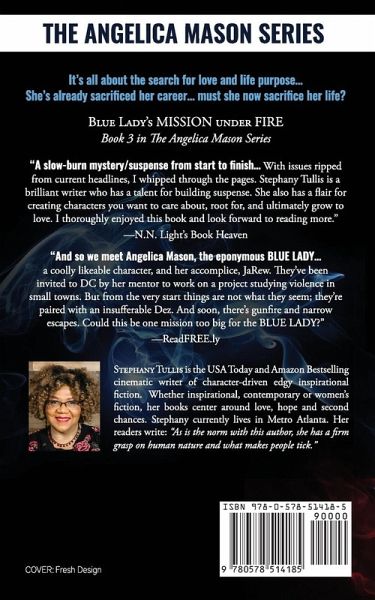 It's all about the search for love and life purpose... Blue Lady's MISSION under FIRE is Book 3 in the Angelica Mason Series. (There are four books in the series.) Book 5, Blue Lady's SEARCH for LOVE will be available in the Spring of 2023). The books revolve around a common theme-- the search for love and life purpose. Which is more important or are they interrelated? With nowhere to run and nowhere to hide, what can she do to survive? The MISSION changed. Her COVER is blown. In Blue Lady's MISSION under FIRE, Angelica Mason (aka,The Blue Lady) along with her faithful sidekick Jonathan C. Jarewski, face new challenges and stare down old demons. When Angelica is fired by her ex-boss, Mayor of her home town Smoothville, Georgia, she eagerly accepts her mentor's offer to serve as his project manager on a controversial federally funded demonstration project. Angelica confronts her first challenge on Day 1 when she arrives in Washington, D.C. and learns that the feds cut the funding for her promised position. She is now one of six hand-picked street organizers who will be working uncover in Upstate New York. When smooth talking private investigator Dez Cooke makes himself quite at home in the first project team meeting and knows more about the planned project than she does, Angelica realizes she is face to face with challenge number two. By the end of the first official briefing session, Angelica learns that a new murder case has been added to the growing list of homicides in the upstate community. This time, two teenagers are killed. Instead of celebrating the 4th of July, another community vigil is held to celebrate the dead. Challenge three. Community leaders call another meeting. But no one has any answers. Challenge four. It starts with a round of tequila shots and a hip swiveling line dance. Did Angelica hear the shots before she felt the shove? Was it an accident? Or was she the target? In the third book in USA Today bestselling author Stephany Tullis' Angelica Mason Series, political operatives Angelica Mason and Jonathan Jarewski find themselves in a MISSION under FIRE.