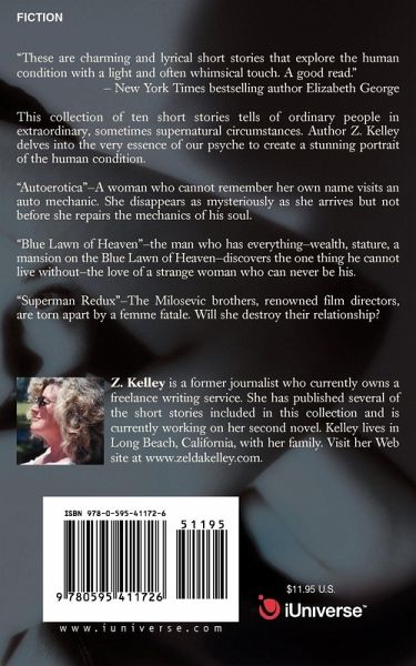 "One morning, a woman went out to walk her dog and returned home a millionaire. What was significant was not that she, a newly recovered alcoholic, redeemed the lottery ticket at B&B Liquors but that, for twenty-three years, she told no one about the winnings." -From the short story "Offshore" This collection of ten short stories tells of ordinary people in extraordinary, sometimes supernatural circumstances. Author Z. Kelley delves into the very essence of our psyche to create a stunning portrait of the human condition. "Autoerotica"-A woman who cannot remember her own name visits an auto mechanic. She disappears as mysteriously as she arrives but not before she repairs the mechanics of his soul. "Blue Lawn of Heaven"-the man who has everything-wealth, stature, a mansion on the Blue Lawn of Heaven-discovers the one thing he cannot live without-the love of a strange woman who can never be his. "Superman Redux"-The Milosevic brothers, renowned film directors, are torn apart by a femme fatale. Will she destroy their relationship?