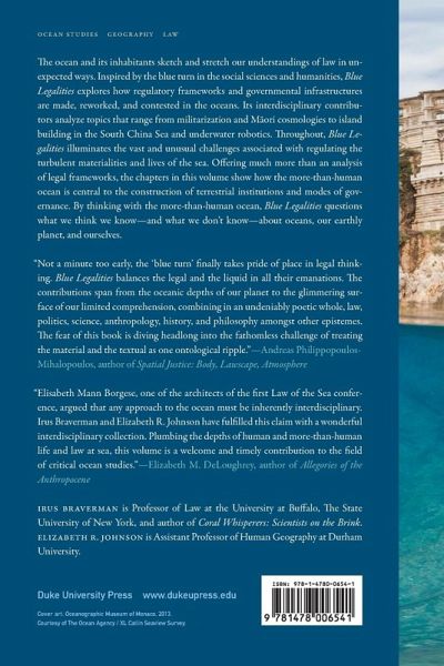 The ocean and its inhabitants sketch and stretch our understandings of law in unexpected ways. Inspired by the blue turn in the social sciences and humanities, Blue Legalities explores how regulatory frameworks and governmental infrastructures are made, reworked, and contested in the oceans. Its interdisciplinary contributors analyze topics that range from militarization and Maori cosmologies to island building in the South China Sea and underwater robotics. Throughout, Blue Legalities illuminates the vast and unusual challenges associated with regulating the turbulent materialities and lives of the sea. Offering much more than an analysis of legal frameworks, the chapters in this volume show how the more-than-human ocean is central to the construction of terrestrial institutions and modes of governance. By thinking with the more-than-human ocean, Blue Legalities questions what we think we know-and what we don't know-about oceans, our earthly planet, and ourselves. Contributors. Stacy Alaimo, Amy Braun, Irus Braverman, Holly Jean Buck, Jennifer L. Gaynor, Stefan Helmreich, Elizabeth R. Johnson, Stephanie Jones, Zsofia Korosy, Berit Kristoffersen, Jessica Lehman, Astrida Neimanis, Susan Reid, Alison Rieser, Katherine G. Sammler, Astrid Schrader, Kristen L. Shake, Phil Steinberg