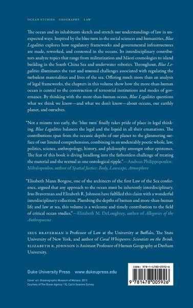 The ocean and its inhabitants sketch and stretch our understandings of law in unexpected ways. Inspired by the blue turn in the social sciences and humanities, Blue Legalities explores how regulatory frameworks and governmental infrastructures are made, reworked, and contested in the oceans. Its interdisciplinary contributors analyze topics that range from militarization and Maori cosmologies to island building in the South China Sea and underwater robotics. Throughout, Blue Legalities illuminates the vast and unusual challenges associated with regulating the turbulent materialities and lives of the sea. Offering much more than an analysis of legal frameworks, the chapters in this volume show how the more-than-human ocean is central to the construction of terrestrial institutions and modes of governance. By thinking with the more-than-human ocean, Blue Legalities questions what we think we know-and what we don't know-about oceans, our earthly planet, and ourselves. Contributors. Stacy Alaimo, Amy Braun, Irus Braverman, Holly Jean Buck, Jennifer L. Gaynor, Stefan Helmreich, Elizabeth R. Johnson, Stephanie Jones, Zsofia Korosy, Berit Kristoffersen, Jessica Lehman, Astrida Neimanis, Susan Reid, Alison Rieser, Katherine G. Sammler, Astrid Schrader, Kristen L. Shake, Phil Steinberg