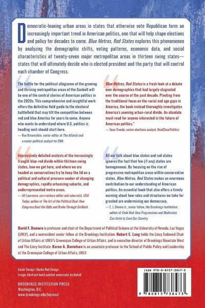 Assessing where the red/blue political line lies in swing states and how it is shifting Democratic-leaning urban areas in states that otherwise lean Republican is an increasingly important phenomenon in American politics, one that will help shape elections and policy for decades to come. Blue Metros, Red States explores this phenomenon by analyzing demographic trends, voting patterns, economic data, and social characteristics of twenty-seven major metropolitan areas in thirteen swing states that will ultimately decide who is elected president and the party that controls each chamber of Congress.
