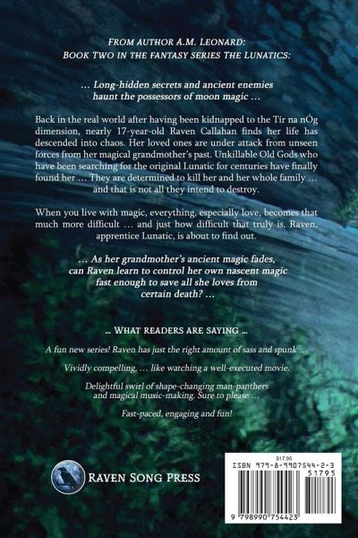... Long-hidden secrets and ancient enemies haunt the possessors of moon magic ... Back in her own world after having been kidnapped to the Tír na nÓg dimension, nearly 17-year-old Raven Callahan finds her life descended into chaos. Her loved ones are under attack from unseen forces from her magical grandmother's past. Unkillable Old Gods that have been searching for the original Lunatic for centuries have finally found her and are determined to kill her and her whole family ... and that is not all they intend to destroy.When you live with magic, everything, especially love, becomes that much more difficult...and just how difficult that truly is, Raven, apprentice Lunatic, is about to find out. ... As her grandmother's ancient magic fades, can Raven learn to control her own nascent magic fast enough to save all she loves from certain death? ...