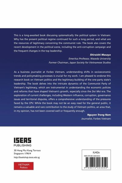 "This is a long-awaited book discussing systematically the political system in Vietnam: Why has the present political regime continued for such a long period, and what are the resources of legitimacy concerning the communist rule. The book also covers the recent development in the political scene, including the anti-corruption campaign and the frequent changes in the top leadership."--Shiraishi Masaya, Emeritus Professor, Waseda University, Former Chairman, Japan Society for Vietnamese Studies "As a business journalist at Forbes Vietnam, understanding shifts in socioeconomic trends and policymaking processes is crucial for my work. I am pleased to endorse this research book on Vietnam politics and the legitimacy-building of the one-party state's leadership. The book delves into the intricate dynamics of the Communist Party of Vietnam's legitimacy, which are instrumental in understanding the economic policies and reforms that have shaped Vietnam's growth, especially since the Doi Moi era. The exploration of current challenges, including Western influence, corruption, governance issues and territorial disputes, offers a comprehensive understanding of the pressures faced by the CPV. While the book may not be an easy read for the general public, it remains a valuable and rare contribution to the study of Vietnam politics, an area that, in my opinion, has not been covered well or frequently enough."--Nguyen Trong Nam, Journalist, Forbes Vietnam