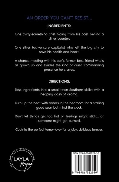 An order you can't resist... Ingredients: One thirty-something chef hiding from his past behind a diner counter. One silver fox venture capitalist who left the big city to save his health and heart. A chance meeting with his son's former best friend who's all grown up and exudes the kind of quiet, commanding presence he craves. Directions: Toss ingredients into a small-town Southern skillet with a heaping dash of drama. Turn up the heat with orders in the bedroom for a sizzling good sear but mind the clock. Don't let things get too hot or feelings might stick... or someone might get burned. Cook to the perfect temp-love-for a juicy, delicious forever. Savor this steamy age-gap M/M romance novella while noshing on your favorite guilty pleasure.