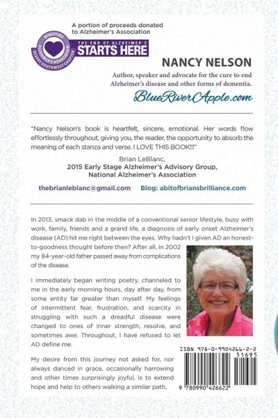 Blue.River.Apple. - SECOND HARVEST - A continuation of Alzheimer's through poetry - covers the following two years of "how-to" wade in the salty dementia truth. It's not lofty or lightly, or unintended, but large, open to receiving and trusting that there is hope and help. It took a lot of "you got this, girl!" self talk to believe. During this time, Nancy's diagnosis changed from early on-set Alzheimer's to Mild Cognitive Impairment. Though a lesser diagnosis, she's not "owned" either title, simply saying she's been diagnoised. Nor has she felt a change in her behavior. Nancy invites you to follow her journey, and invites you to , "Please, hold my hand, feel, truly feel ... you are not alone...because you're not." Nancy believes it is the love and service we give to others that lightens our own way.