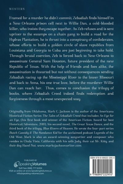 Framed for a murder he didn't commit, Zebadiah finds himself in a New Orleans prison cell next to Willie Dan, a cold-blooded killer, who insists they escape together. As Zeb refuses and is sent upriver to the swamps on a chain gang to build a road for the Hydras Plantation, he is thrust into a conspiracy of confederates, whose efforts to build a golden circle of slave republics from Louisiana and Georgia to Cuba are just beginning to take hold. Through brutal coercion, Zeb is forced back to New Orleans to assassinate General Sam Houston, future president of the new Republic of Texas. With the help of friends and foes alike, the assassination is thwarted but not without consequences sending Zebadiah racing up the Mississippi River to the lower Missouri and back to Anna, his one true love, before the murderer Willie Dan can reach her. Thus, comes to conclusion the trilogy of books, where Zebadiah Creed indeed finds redemption and forgiveness through a most unexpected way.