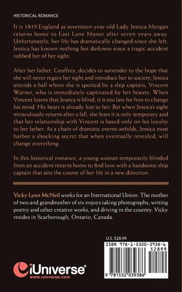 It is 1819 England as seventeen-year-old Lady Jessica Morgan returns home to East Lane Manor after seven years away. Unfortunately, her life has dramatically changed since she left. Jessica has known nothing but darkness since a tragic accident robbed her of her sight. After her father, Geoffrey, decides to surrender to the hope that she will never regain her sight and introduce her to society, Jessica attends a ball where she is spotted by a ship captain, Vincent Warner, who is immediately captivated by her beauty. When Vincent learns that Jessica is blind, it is too late for him to change his mind. His heart is already lost to her. But when Jessicas sight miraculously returns after a fall, she fears it is only temporary and that her relationship with Vincent is based only on his loyalty to her father. As a chain of dramatic events unfolds, Jessica must harbor a shocking secret that when eventually revealed, will change everything. In this historical romance, a young woman temporarily blinded from an accident returns home to find love with a handsome ship captain that sets the course of her life in a new direction.