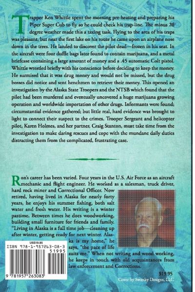 Alaska trapper Ken Whittle prepped his Super Cub airplane for the minus 20-degree Alaska weather. Flying to his trap lines, approaching the first frozen lake on his route, he finds a plane below him nose down in the trees. Landing on the frozen lake, Whittle finds the pilot dead, frozen in his seat. Four duffle bags full of marijuana and metal briefcase with a substantial amount of cash and a .45 automatic Colt pistol inside tempts the trapper. Wrestling briefly with his conscience, he chooses to keep the money, wrongly surmising drug money wouldn't be missed. Drug bosses would notice and send henchmen to retrieve the cash. Whittle notified authorities of the crash and Alaska State Troopers, along with NTSB investigators discover the pilot was murdered. As the case escalates, a massive marijuana grow operation connected to worldwide importation of illicit drugs is uncovered, Informants are found, and circumstantial evidence gathered. Little tangible hard evidence is brought to light that might connect suspects to the crimes. Trooper Seargent and helicopter pilot Karen Holmes and her partner Trooper Craig Stanton are tasked as leads in the web of investigations, responding in daring rescues along with mundane duties that distract from this complicated, dangerous and frustrating case.