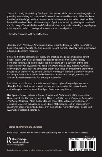 Blue Sky Body: Thresholds for Embodied Research is the follow-up to Ben Spatz's 2015 book What a Body Can Do, charting a course through more than twenty years of embodied, artistic, and scholarly research.