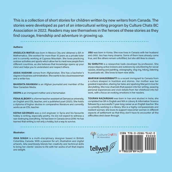 This is a collection of short stories for children written by new writers from Canada. The stories were developed as part of an intercultural writing program by Culture Chats BC Association in 2022. Readers may see themselves in the heroes of these stories as they find courage, friendship and adventure in growing up.