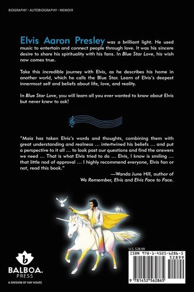 Elvis Aaron Presley was a brilliant light. He used music to entertain and connect people through love. It was his sincere desire to share his spirituality with his fans. In Blue Star Love, his wish now comes true. Take this incredible journey with Elvis, as he describes his home in another world, which he calls the Blue Star. Learn of Elvis’s deepest innermost self and beliefs about life, love, and reality. In Blue Star Love, you will learn all you ever wanted to know about Elvis but never knew to ask! "Maia has taken Elvis’s words and thoughts, combining them with great understanding and realness … intertwined his beliefs … and put a perspective to it all … to look past our questions and find the answers we need … That is what Elvis tried to do … Elvis, I know is smiling … that little nod of approval … I highly recommend everyone, Elvis fan or not, read this book." —Wanda June Hill, author of We Remember, Elvis and Elvis Face to Face.