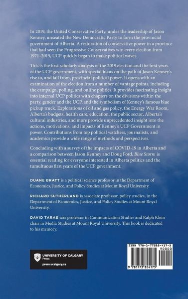 In 2019, the United Conservative Party, under the leadership of Jason Kenney, unseated the New Democratic Party to form the provincial government of Alberta. A restoration of conservative power in a province that had seen the Progressive Conservatives win every election from 1971-2015, UCP quickly began to make political waves. This is the first scholarly analysis of the 2019 election and the first years of the UCP government, with special focus on the path of Jason Kenney's rise to, and fall from, provincial political power. It opens with an examination of the election from a number of vantage points, including the campaign, polling, and online politics. It provides fascinating insight into internal UCP politics with chapters on the divisions within the party, gender and the UCP, and the symbolism of Kenney's famous blue pickup truck. Explorations of oil and gas policy, the Energy War Room, Alberta's budgets, health care, education, the public sector, Alberta's cultural industries, and more provide unprecedented insight into the actions, motivations, and impacts of Kenney's UCP Government in power. Contributions from top political watchers, journalists, and academics provide a wide range of methods and perspectives. Concluding with a survey of the impacts of COVID-19 in Alberta and a comparison between Jason Kenney and Doug Ford, Blue Storm is essential reading for everyone interested in Alberta politics and the tumultuous first years of the UCP government. Providing key insights from perspectives across the political spectrum, this book is a captivating deep-dive into an unprecedented party, its often controversial politics, and its unforgettable leader.